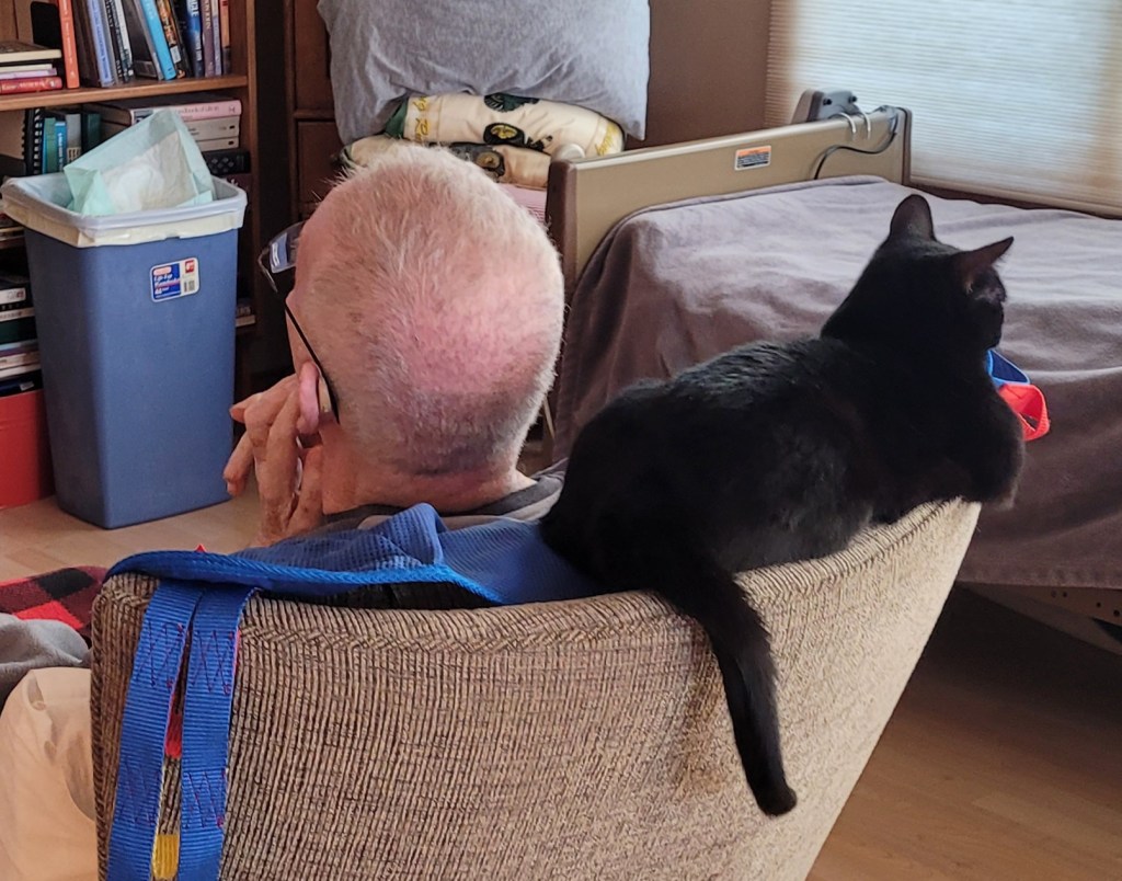 Eventually he will ask for the cat. I can produce a cat. He will hold Shadow on his lap and feel her and this morning he settled down. I am grateful that she does cozy up to him and sit on his lap quite often. She is little and black, like “the dog”.