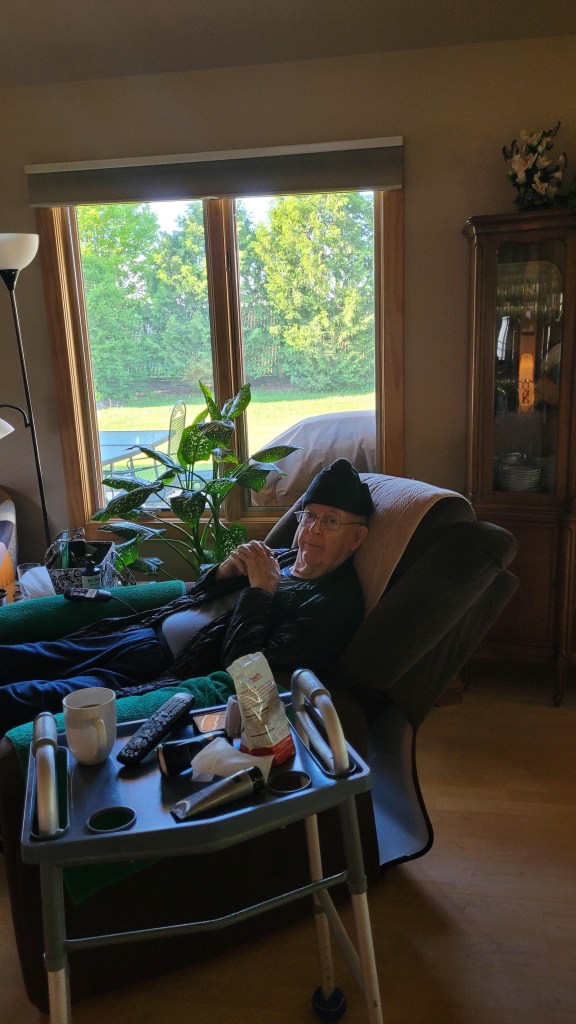 He has three places in the house where he can be found – in bed, at the table and in his lift recliner. It is June but his stocking hat is what keeps him comfortable at night.