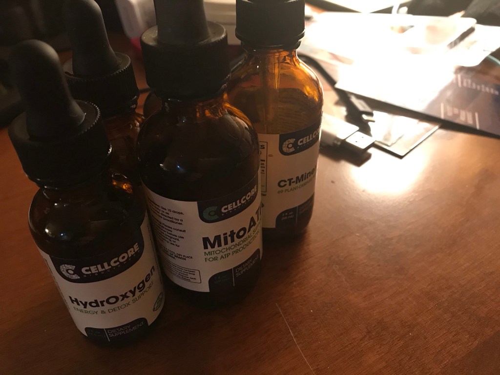 Light therapy, sound frequency therapy, essential oil therapy, as well as all the regular chiropractic adjusting gets done every time we go there. We also have potions from a company called CellCore for mitochondrial support and ATP function, Hydroxygen for energy and detox support, a mineral supplement and a parasitical. Evidently there are parasites present somewhere. But I really haven’t seen any positive changes over the last month. I know these things take time, but even the chiropractor thought there would be some improvement by now.
