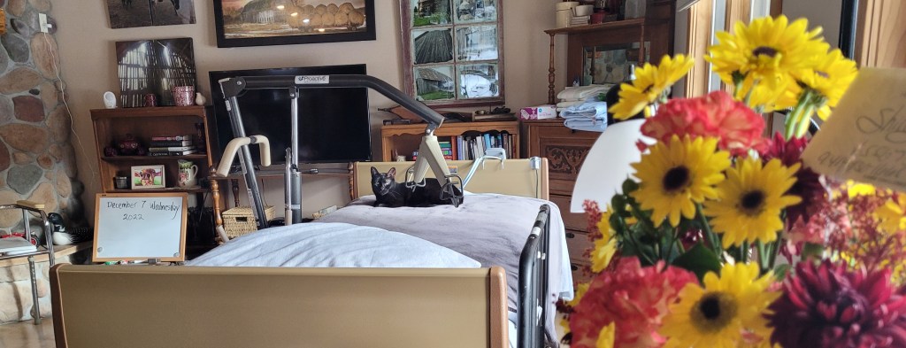 During his “up” time, I find videos or tv programs for him to listen to. He seldom opens his eyes to watch things but he is often listening. He sleeps a good deal of the time. He gets another feeding around 11. Workers from Hospice do their weekly checking during this time. His RN comes on Tuesdays, the CNA on Thursday mornings. The chaplain has checked in with us, and a volunteer comes once a week to give me free time for a couple hours. I busy myself with daily laundry, ordering supplies, basic housekeeping, and caring for his physical needs until around 3 in the afternoon, when I help him back to bed. I move him with a Hoyer lift, which makes it pretty easy, but it does require some experience. Thankfully, I have years of that with a former client.