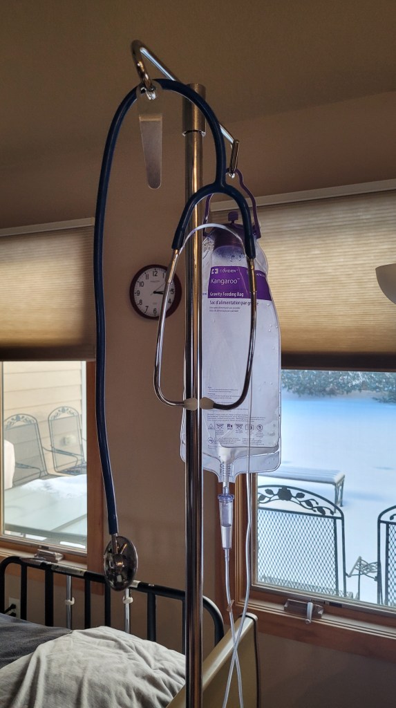 However, there is the question of whether or not we can actually do this as well as we would like. I’ve put a lot of thought and effort into getting equipment, supplies, formula for his tube feedings, and helpers. Most weekdays I will have help for two hours in the morning and two hours in the evening. I have friends who will come and give me breaks for exercise, and appointments around town. B